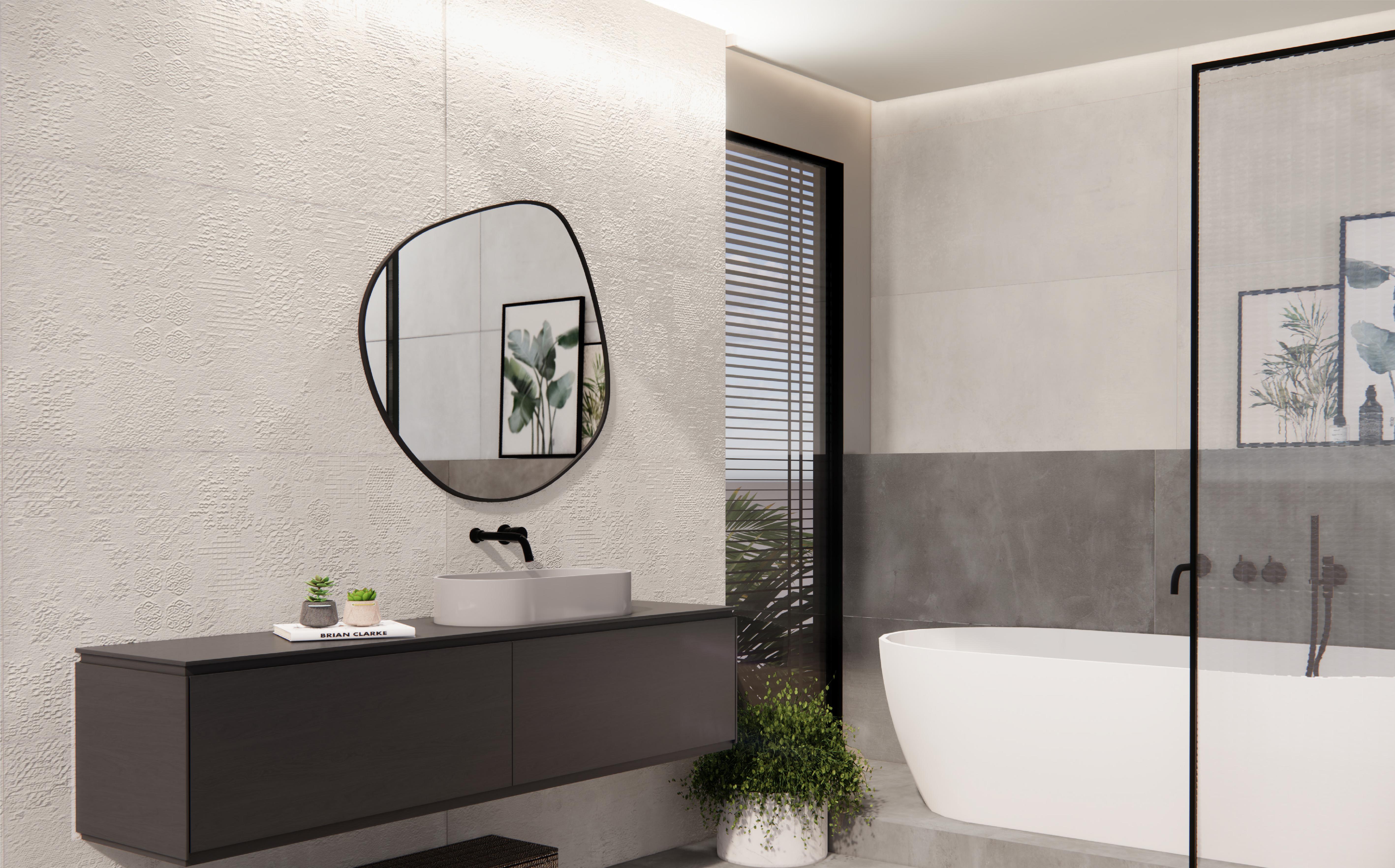 Vă propunem placa ceramică PRIMA cu efect de beton minimalist, fabricată în Italia, dimensiuni 60x60 cm, suprafață mată.