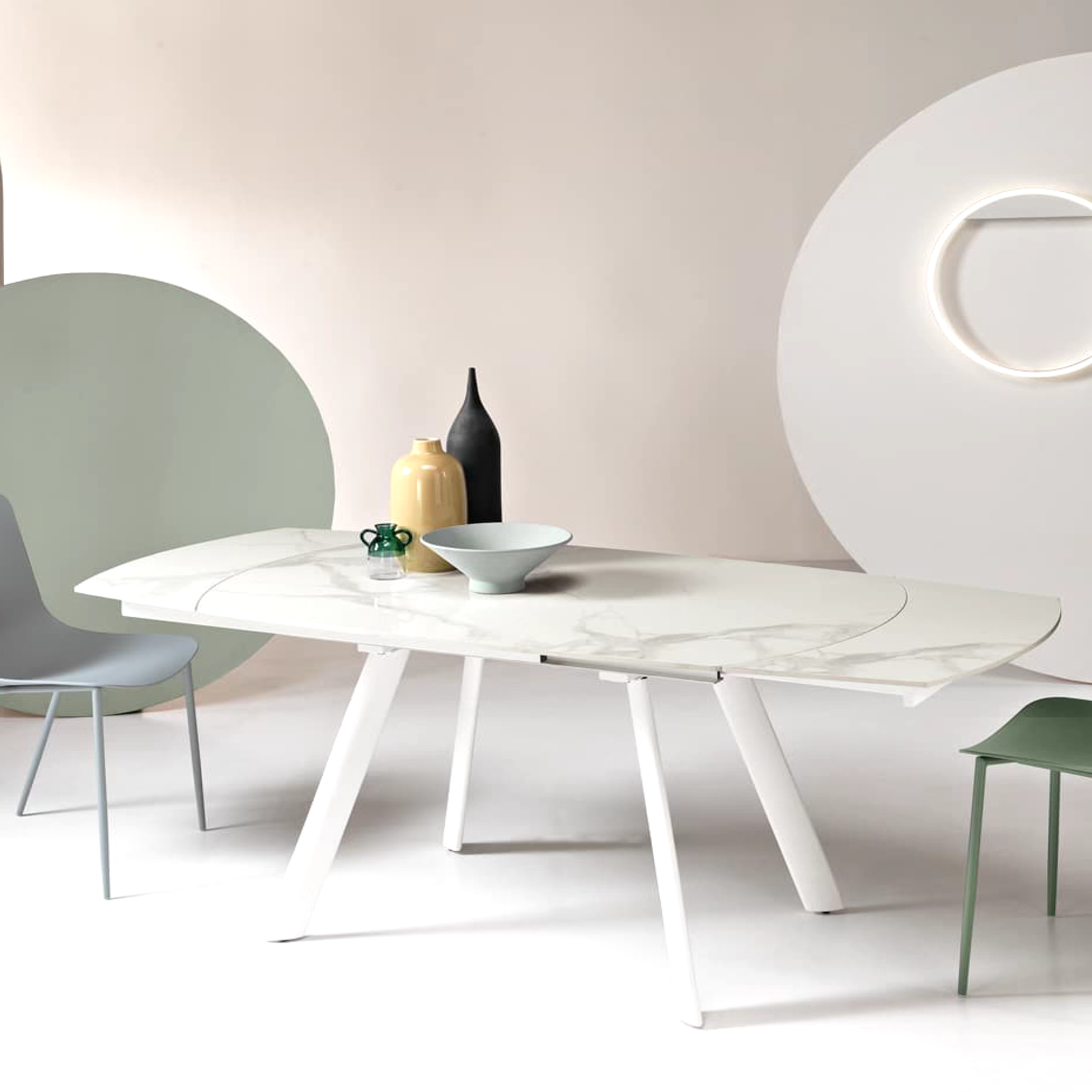 Scaun din polipropilenă cu bază din metal vopsit și scaun tapițat cu piele ecologică. Disponibil în diferite culori.