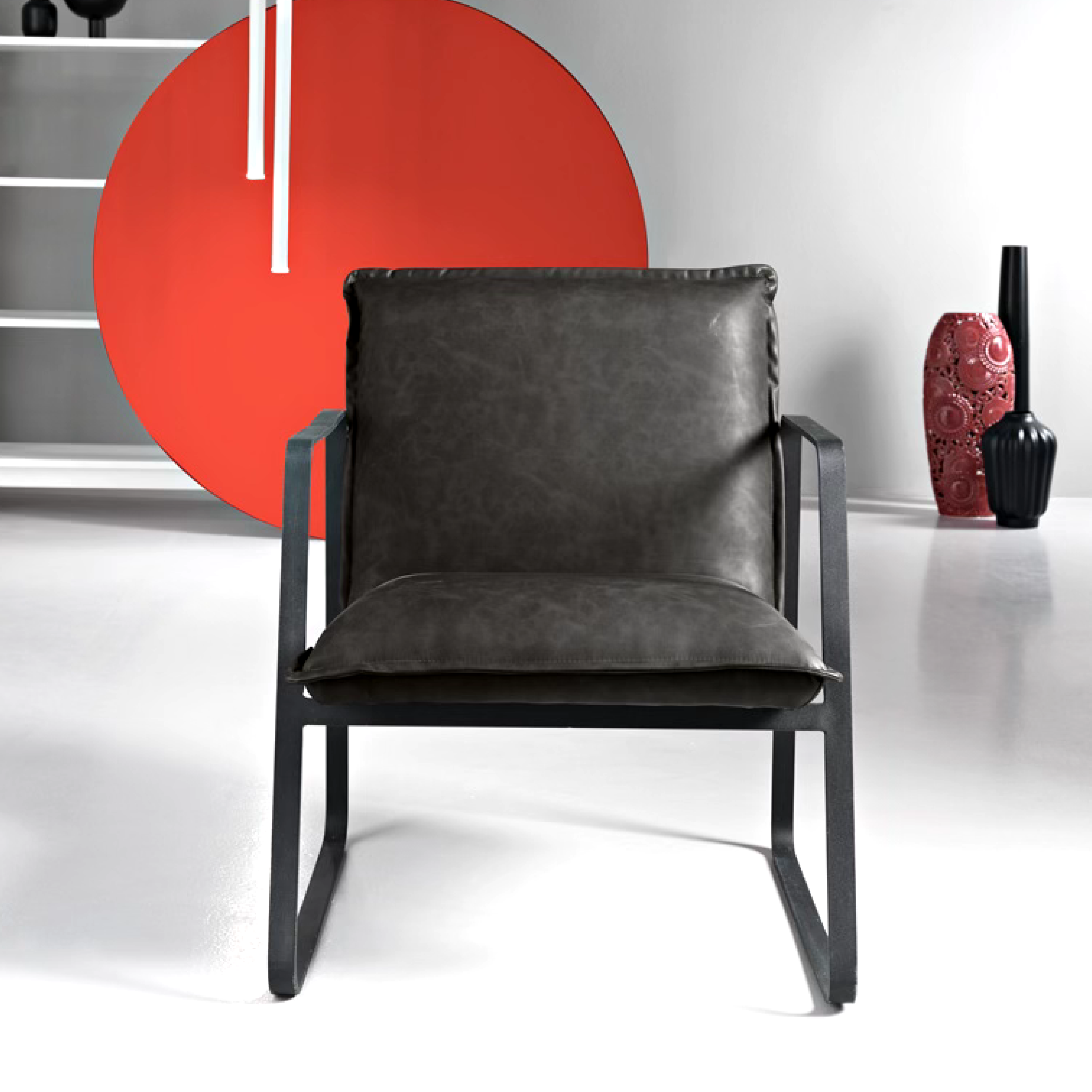 Fotoliu din piele ecologică nuanțată cu cadru din metal vopsit. Disponibil în diferite culori.
