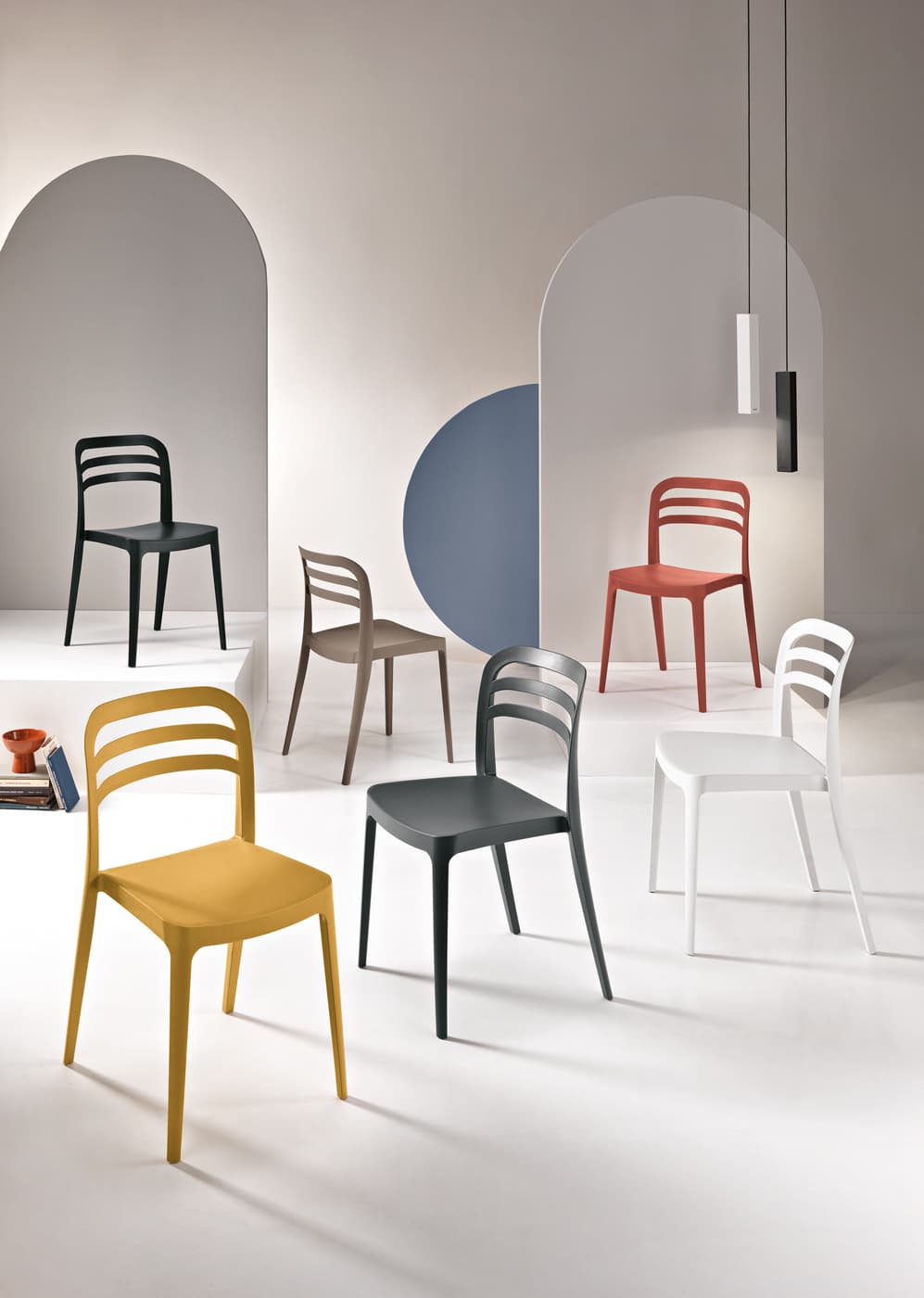 Scaun stivuibil din polipropilenă. Disponibil în diferite culori.