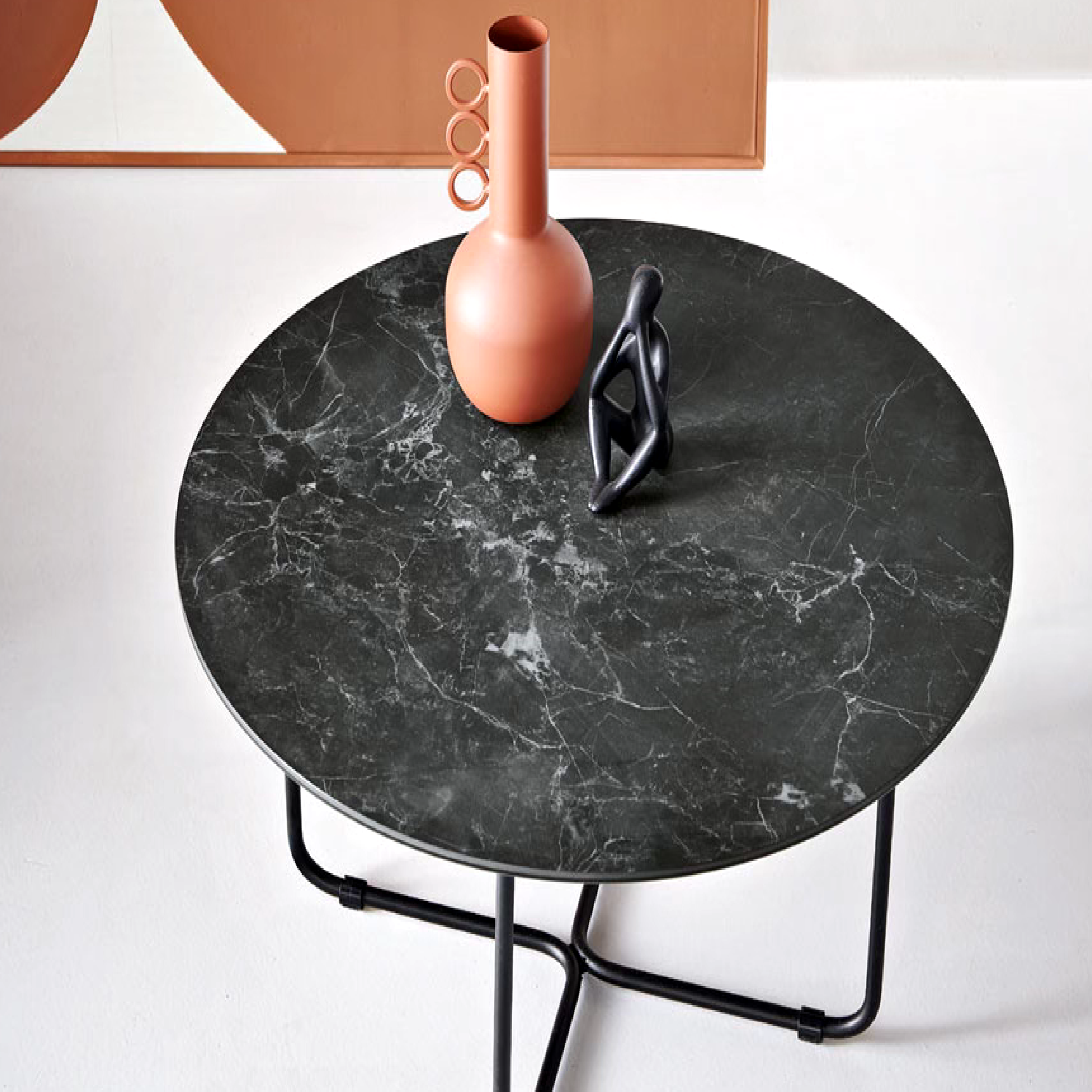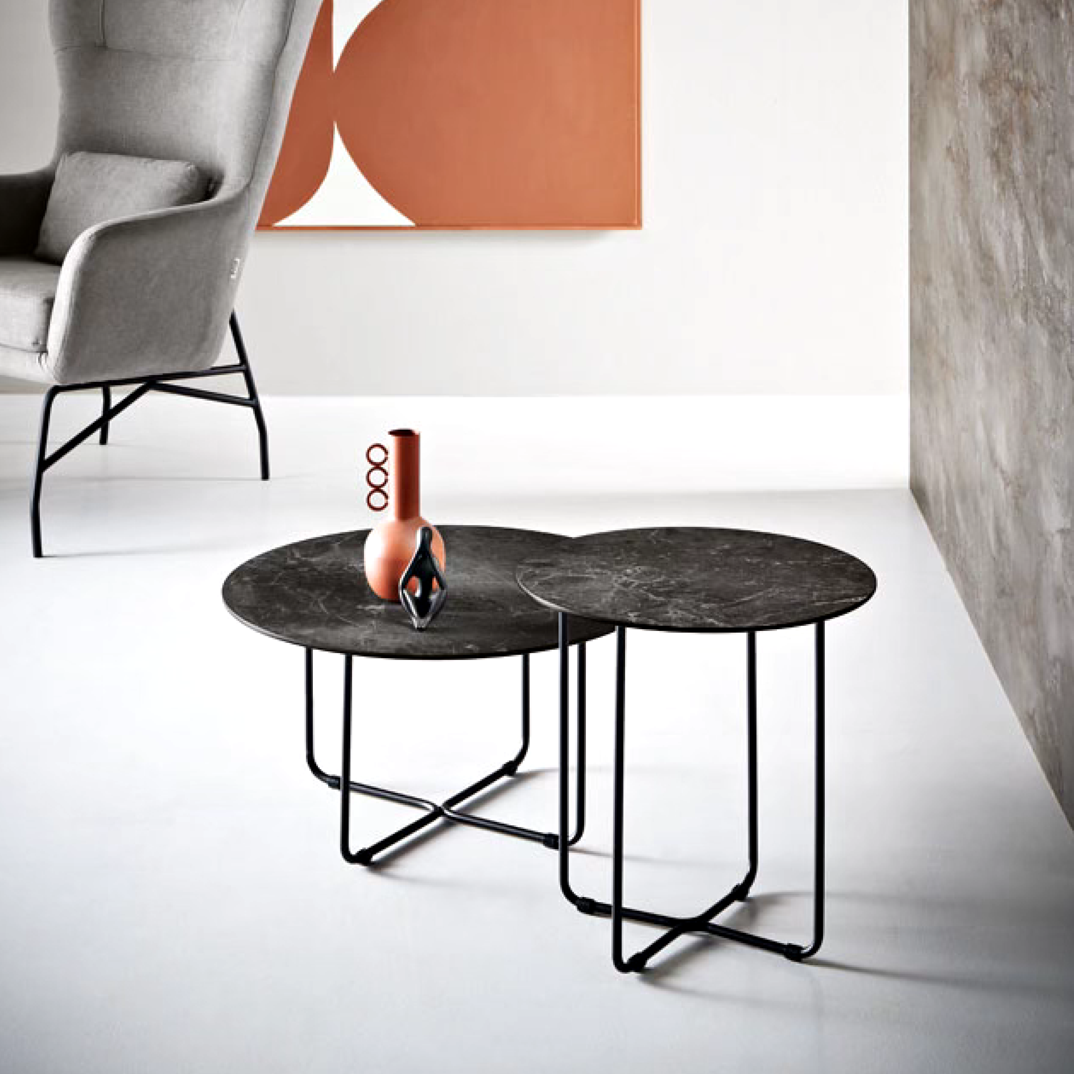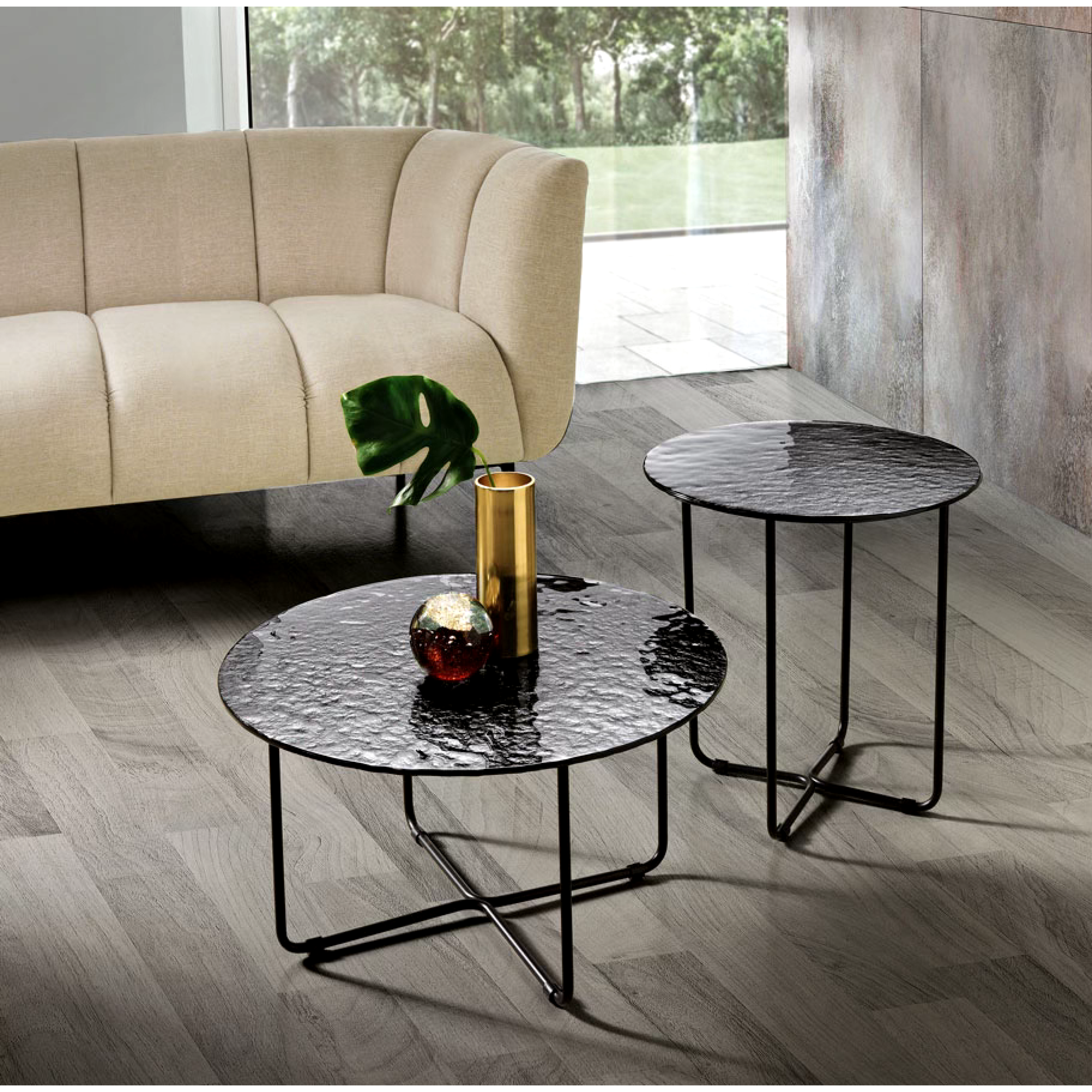 Măsuță de cafea cu cadru metalic și blat în două versiuni: sticlă martelată cu spate argintat sau ceramică cu efect de marmură stratificată pe sticlă.