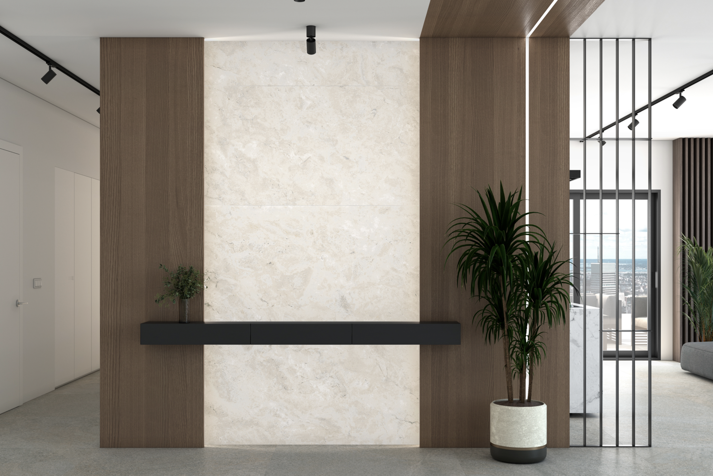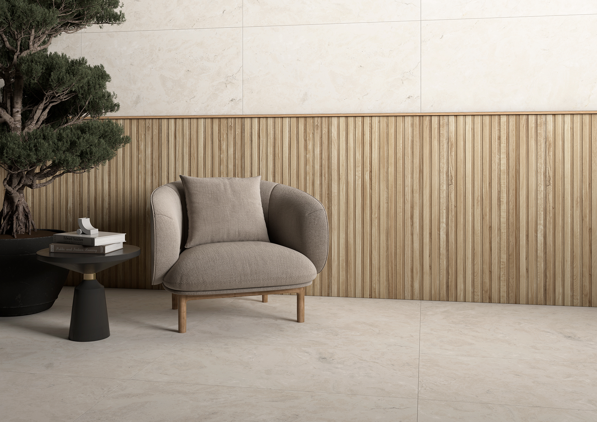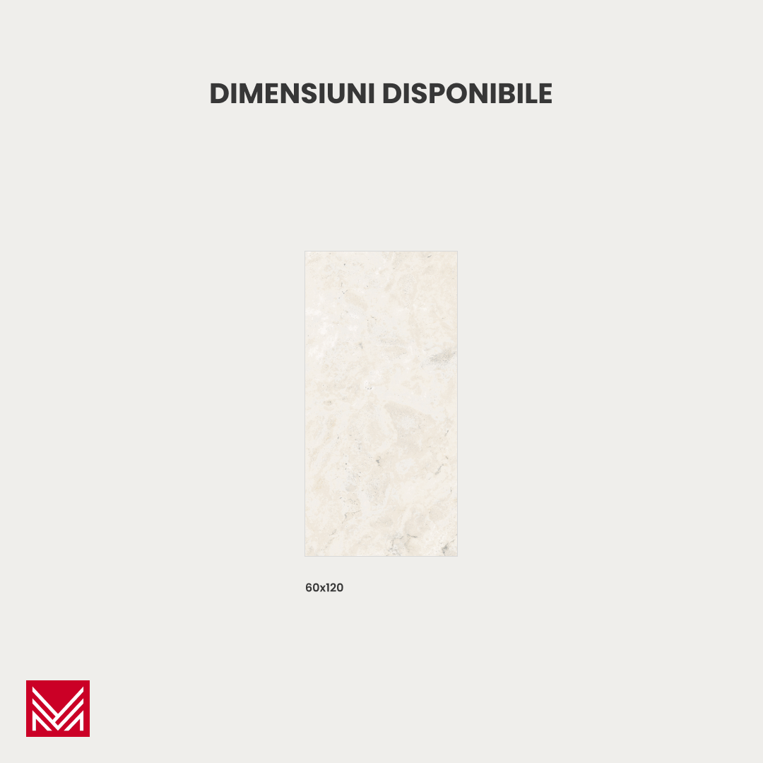 Vă propunem placa ceramică PRIMA cu efect de beton minimalist, fabricată în Italia, dimensiuni 60x60 cm, suprafață mată.