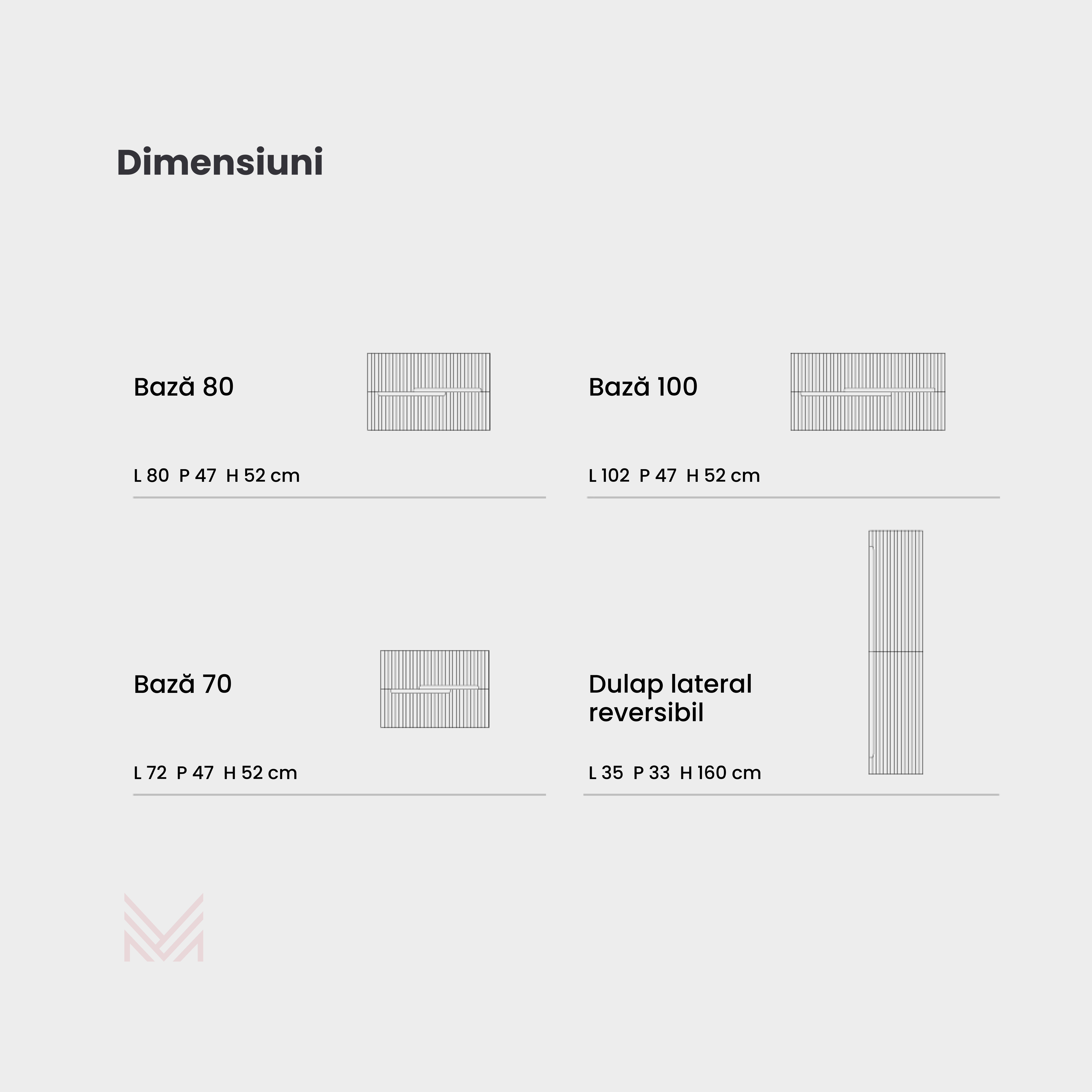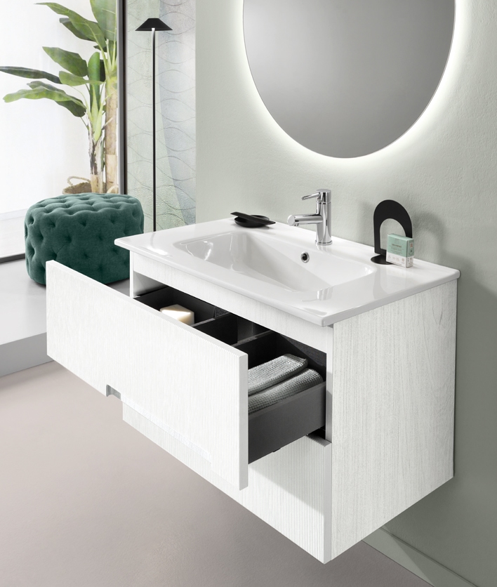 Bază suspendată cu structură din pvc cu efect dungat și sertare cu închidere lentă (sistem soft-close).